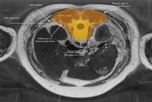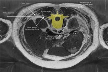 The last concept has been allocated the following definition: This volume includes the spinal column, its spaces and contents, notably the spinal canal, spinal meninges and spinal cord. It also includes the muscles associated with the spine within (and including) the anterior and posterior thoracolumbar fascia and its equivalent nuchal fascia in the neck. This region also includes the spinal ventral (anterior) and dorsal (posterior) roots, the dorsal root (spinal) ganglions and the spinal nerve trunks.