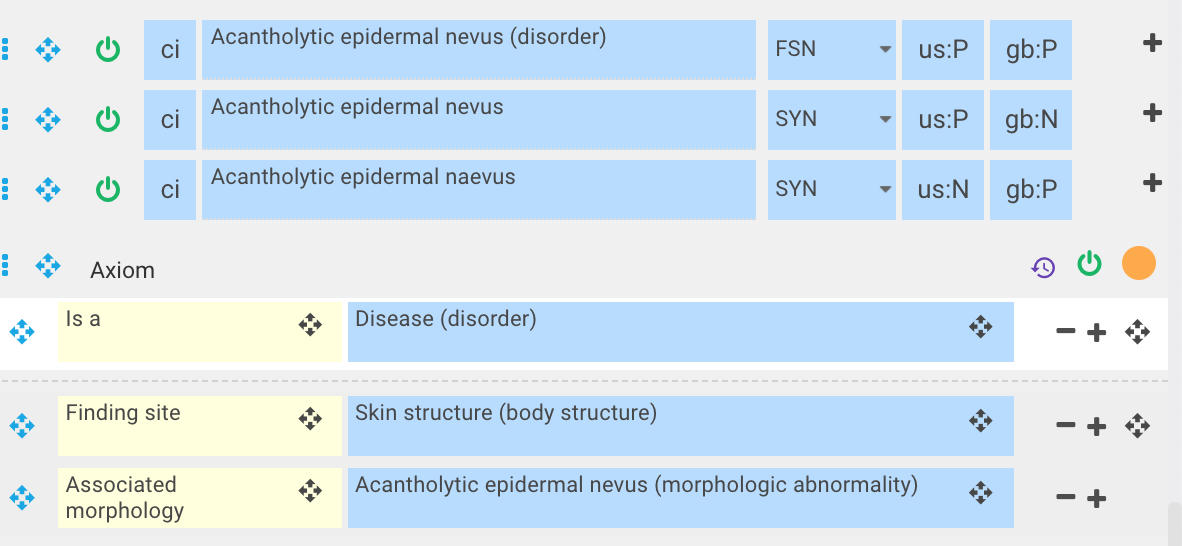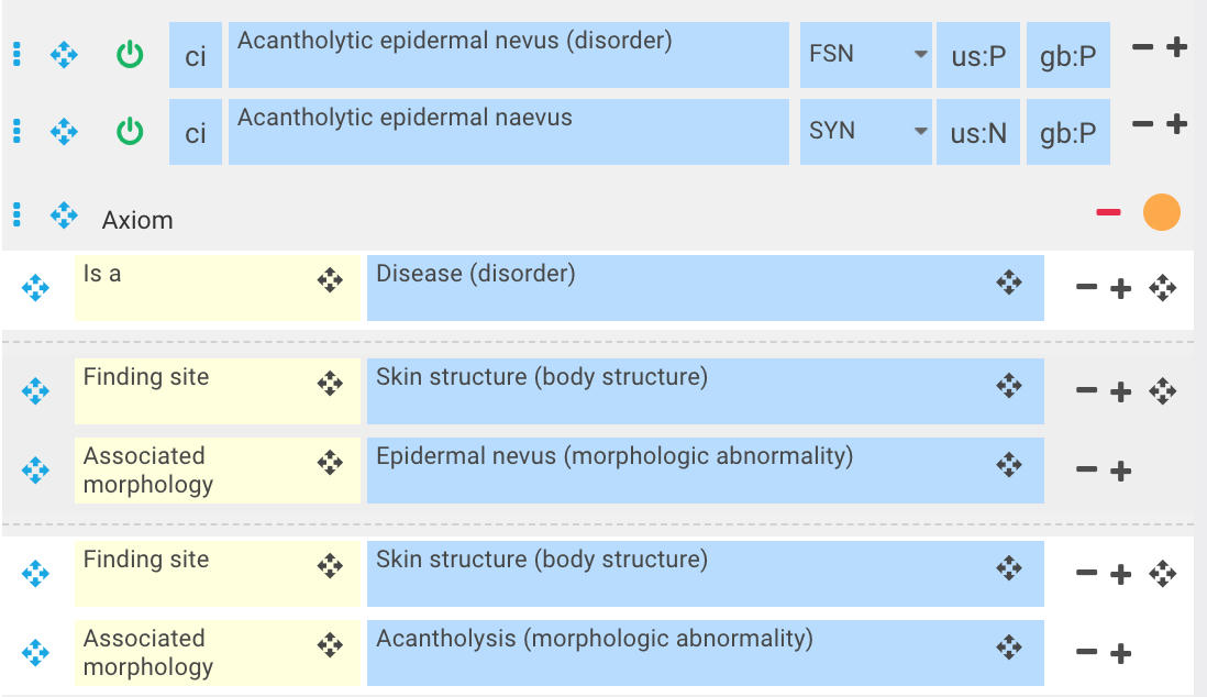 If 400067002 |Acantholytic epidermal nevus (disorder)| had the same Finding site of |Skin structure (body structure)| with two different morphologic abnormalities of |Epidermal nevus (morphologic abnormality)| and |Acantholysis (morphologic abnormality)|, then those two morphologic abnormality concepts can be combined to create a single, primitive, morphologic abnormality concept of |Acantholytic epidermal nevus (morphologic abnormality)|. This will prevent modeling with two relationship groups.