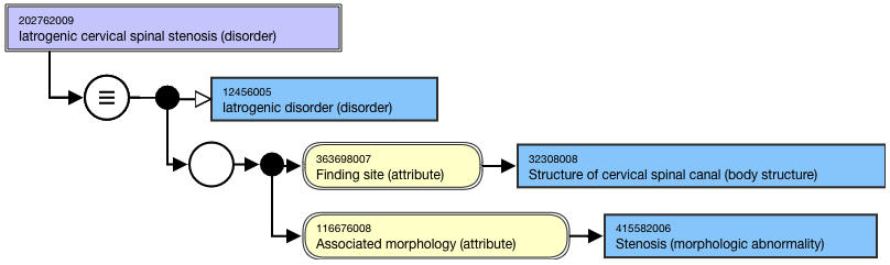 <figure><img src="https://github.com/SNOMED-Documents/snomed-editorial-guide/blob/main/authoring/clinical-finding-and-disorder/images/174690514.png" alt=""><figcaption><p>Figure: Stated view of |Iatrogenic cervical spinal stenosis (disorder)| using IS_A 12456005 |Iatrogenic disorder (disorder)|</p></figcaption></figure>