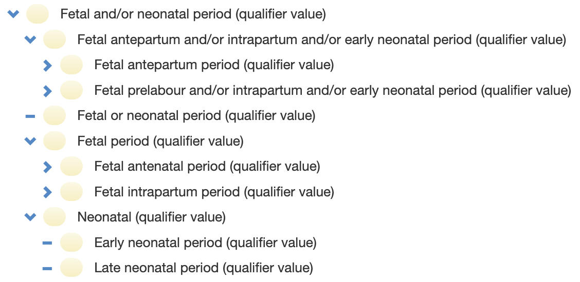 * The *fetal* ***and/or*** *neonatal* period is explicitly designed to subsume the fetal period, the *neonatal period* , and in rare cases where these two may overlap, as in 1193538001 |Fetal intrapartum second stage and/or early neonatal period (qualifier value).