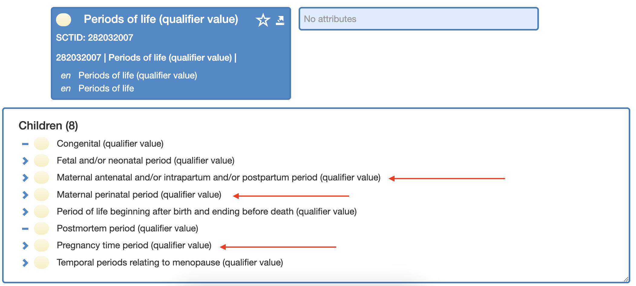 The life phase of pregnancy-related findings and disorders is applied using the Occurrence (attribute). A concept must identify: