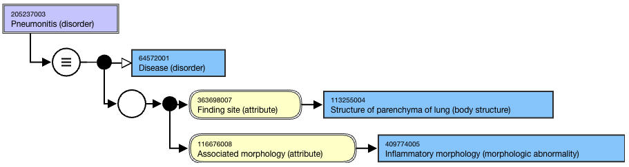 <figure><img src="https://github.com/SNOMED-Documents/snomed-editorial-guide/blob/main/authoring/clinical-finding-and-disorder/images/225051456.png" alt=""><figcaption><p>Figure: Stated view of 205237003 |Pneumonitis (disorder)|</p></figcaption></figure>