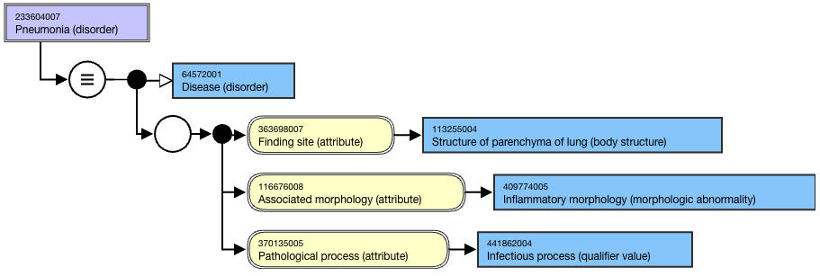 <figure><img src="https://github.com/SNOMED-Documents/snomed-editorial-guide/blob/main/authoring/clinical-finding-and-disorder/images/225051457.png" alt=""><figcaption><p>Figure: Stated view of 233604007 |Pneumonia (disorder)|</p></figcaption></figure>