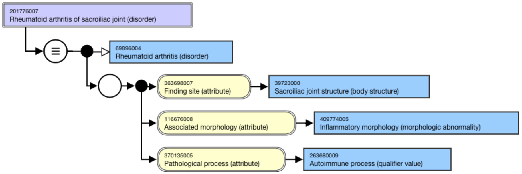 <figure><img src="https://github.com/SNOMED-Documents/snomed-editorial-guide/blob/main/authoring/clinical-finding-and-disorder/images/174690543.png" alt=""><figcaption><p>Figure. Stated view of 201776007 |Rheumatoid arthritis of sacroiliac joint (disorder)|</p></figcaption></figure>