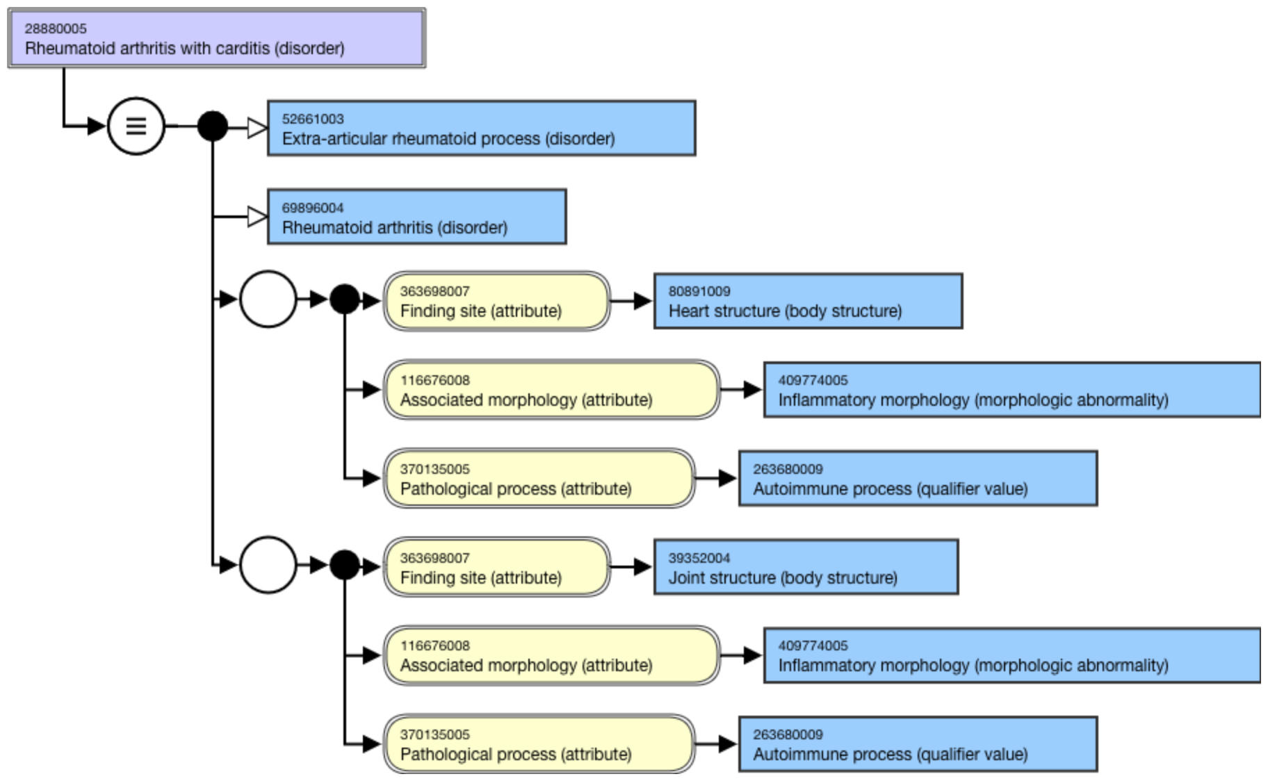 <figure><img src="https://github.com/SNOMED-Documents/snomed-editorial-guide/blob/main/authoring/clinical-finding-and-disorder/images/174690542.png" alt=""><figcaption><p>Figure: Stated view of 28880005 |Rheumatoid arthritis with carditis (disorder)|</p></figcaption></figure>