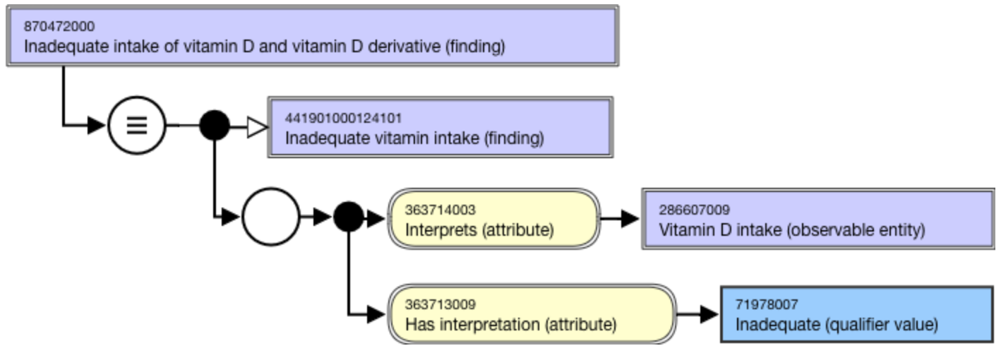 <figure><img src="https://3063935683-files.gitbook.io/~/files/v0/b/gitbook-x-prod.appspot.com/o/spaces%2FSZh4aZdgpviXMYp37bCy%2Fuploads%2Fgit-blob-56efd9f88ec53002362c26d9240bfdce777b67b1%2F174690341.png?alt=media" alt=""><figcaption><p>Inferred view of Inadequate intake of vitamin D and vitamin D derivative (finding)</p></figcaption></figure>