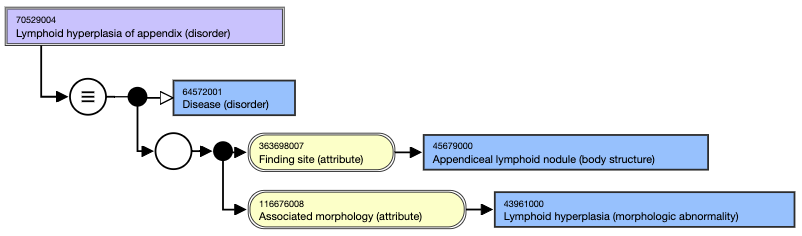 * 70529004 | Lymphoid hyperplasia of appendix (disorder)| has | Associated morphology (attribute)| of 43961000 | Lymphoid hyperplasia (morphologic abnormality)| and a | Finding site (attribute)| of 45679000 | Appendiceal lymphoid nodule (body structure)|