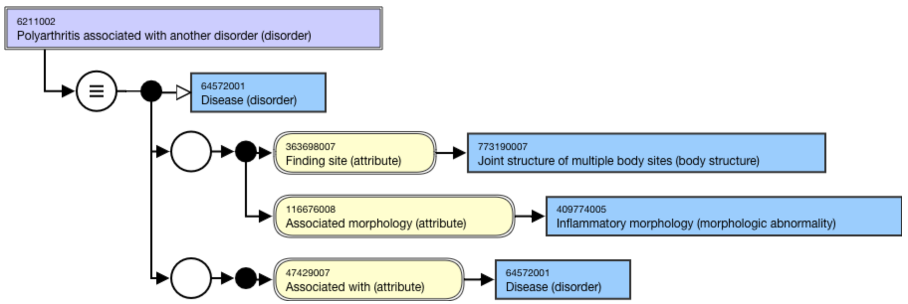 <figure><img src="https://3063935683-files.gitbook.io/~/files/v0/b/gitbook-x-prod.appspot.com/o/spaces%2FSZh4aZdgpviXMYp37bCy%2Fuploads%2Fgit-blob-c47c56e033dd07e8410b345f8dc3e88737037b6b%2F174690339.png?alt=media" alt=""><figcaption><p>Stated view of 6211002 |Polyarthritis associated with another disorder (disorder)| using the |Associated with (attribute)|</p></figcaption></figure>