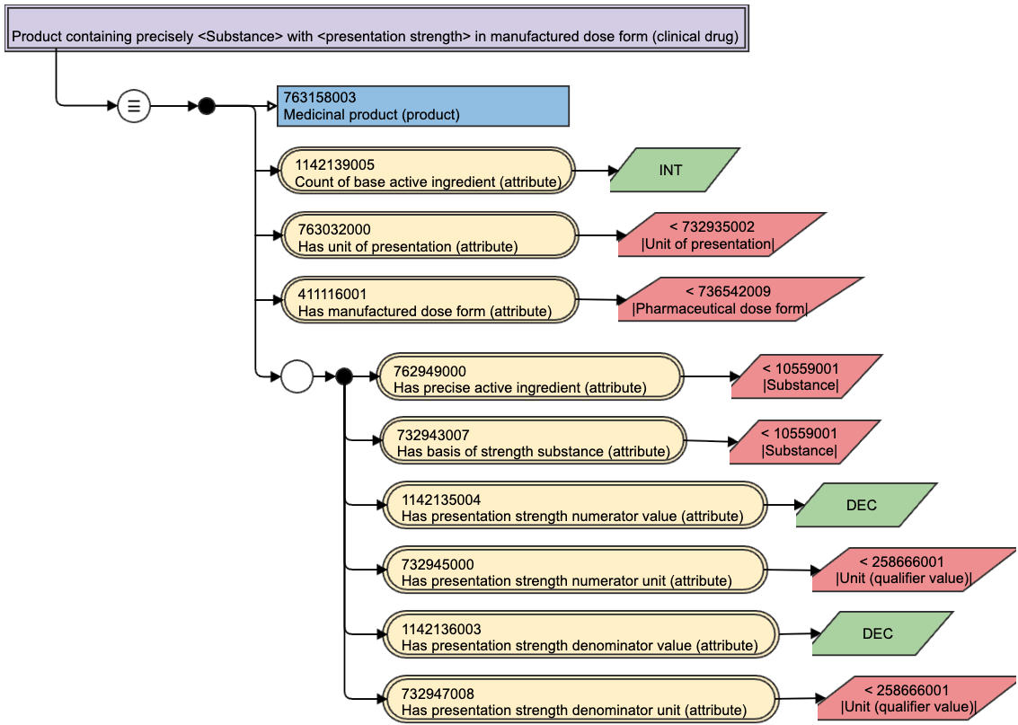 <table data-header-hidden><thead><tr><th width="374"></th><th></th></tr></thead><tbody><tr><td><strong>Stated parent</strong></td><td><code>763158003 |Medicinal product (product)</code></td></tr><tr><td><strong>Semantic tag</strong></td><td>(clinical drug)</td></tr><tr><td><strong>Definition status</strong></td><td><p>Defined</p><ul><li><p>Exception:</p><ul><li>Concepts with product strength that is "not equal to" (e.g. with product strength expressed as a range, greater than, or less than) will have a definition status of Primitive.</li></ul></li></ul></td></tr><tr><td><p><strong>Attribute:</strong></p><p>Has manufactured dose form</p></td><td><p><strong>Range:</strong> <code>&#x3C;736542009 |Pharmaceutical dose form (dose form)</code></p><ul><li>While the allowed range for this attribute is broader, the CD-precise<br>discrete dose form concepts should only use <code>&#x3C;736542009 |Pharmaceutical dose form (dose form)|</code>, excluding grouper concepts based on intended site (e.g. <code>740596000 |Cutaneous dose form (dose form)|</code>, <code>385268001 |Oral dose form (dose form)|</code>)</li></ul><p><strong>Cardinality:</strong> 1..1</p><p>Powder and granules for oral suspension, solution, etc. may be modeled using<br>concentration strength and the administrable dose form (e.g. <code>1145409004 |Product</code><br><code>containing precisely amoxicillin 25 milligram/1 milliliter and clavulanic acid (as clavulanate</code><br><code>potassium) 6.25 milligram/1 milliliter conventional release oral suspension (clinical drug)|</code>)</p></td></tr><tr><td><p><strong>Attribute:</strong></p><p>Has unit of presentation</p></td><td><p><strong>Range:</strong> <code>&#x3C;732935002 |Unit of presentation (unit of presentation)|</code></p><p><strong>Cardinality:</strong> 1..1</p><p><strong>Note:</strong></p><ul><li>This is the countable entity in which the clinical drug is presented</li><li>See <a href="../../pharmaceutical-and-biologic-product-and-dose-form-attributes-summary/appendix-a-product-patterns"><em>Appendix A: Product Patterns</em></a> for the various patterns of use for the unit of presentation</li></ul></td></tr><tr><td><p><strong>Attribute:</strong></p><p>Count of base of active ingredient (attribute)</p></td><td><p><strong>Concrete Type:</strong> Integer</p><p><strong>Range:</strong> >#0..</p><p><strong>Cardinality:</strong> 1..1</p></td></tr><tr><td><strong>Relationship group</strong></td><td><strong>One relationship group containing one instance of each of the following attributes is required for each precise active ingredient.</strong></td></tr><tr><td><p><strong>Attribute</strong>:</p><p>Has precise active ingredient</p></td><td><p><strong>Range:</strong> <code>&#x3C;105590001 |Substance (substance)|</code> excluding concepts representing structural groupers, dispositions, or combined substances</p><p><strong>Cardinality:</strong> 1..1 per relationship group</p><p><strong>Note</strong>:</p><ul><li>The PAI cannot be modeled as a substance hydrate or solvate unless the BoSS is expressed as a hydrate or solvate.</li><li>Concepts containing pancreatic enzymes are modeled based on the discrete enzymes; because of variability between real clinical drugs, synonyms representing a total amount in a particular product will not be included in the International Release.</li></ul></td></tr><tr><td><p><strong>Attribute</strong>:</p><p>Has basis of strength substance</p></td><td><p><strong>Range</strong>: <code>&#x3C;105590001 |Substance (substance)|</code> excluding concepts representing structural groupers, dispositions, or combined substances</p><p><strong>Cardinality</strong>: 1..1 per relationship group</p></td></tr><tr><td><strong>Attribute</strong>:<br>Has presentation strength numerator value</td><td><p><strong>Concrete Type</strong>: Decimal</p><p><strong>Range:</strong> >#0..</p><p><strong>Cardinality</strong>: 1..1 per relationship group</p></td></tr><tr><td><strong>Attribute</strong>:<br>Has presentation strength numerator unit</td><td><p><strong>Range</strong>: <code>&#x3C;767524001 |Unit of measure (qualifier value)|</code></p><p>Cardinality: 1..1 per relationship group</p></td></tr><tr><td><strong>Attribute</strong>:<br>Has presentation strength denominator value</td><td><p><strong>Concrete Type</strong>: Decimal</p><p><strong>Range</strong>: >#0..</p><p><strong>Cardinality</strong>: 1..1 per relationship group</p><p>For this pattern, the attribute value is 1.</p><p>The denominator strength value is required for concepts in the International Release, even if the value = 1, because including denominators for only some concepts negatively affects the classification results.</p></td></tr><tr><td><strong>Attribute:</strong><br>Has presentation strength denominator unit</td><td><p><strong>Range</strong>: <code>&#x3C;767524001 |Unit of measure (qualifier value)|</code></p><ul><li>While the allowed range for this attribute is broader, the CD-precise concepts representing discrete dose forms should only use <code>&#x3C;732935002 |Unit of presentation (unit of presentation)</code>.</li></ul><p><strong>Cardinality</strong>: 1..1 per relationship group</p></td></tr></tbody></table>