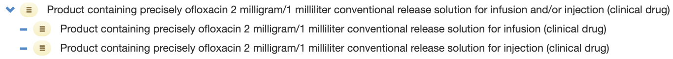 <figure><img src="https://3063935683-files.gitbook.io/~/files/v0/b/gitbook-x-prod.appspot.com/o/spaces%2FSZh4aZdgpviXMYp37bCy%2Fuploads%2Fgit-blob-ca1f7fe2590f571eebb235701b7b1e532116352f%2Fimage%20(78).png?alt=media" alt=""><figcaption><p>Stated view of 1252729004 |Product containing precisely ofloxacin 2 milligram/1 milliliter conventional release solution for infusion and/or injection (clinical drug)|</p></figcaption></figure>