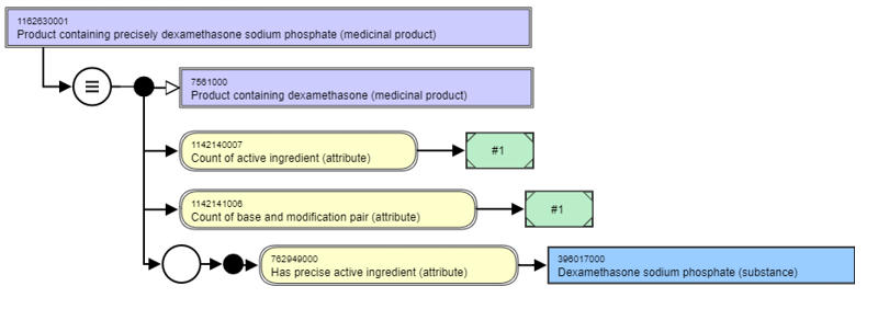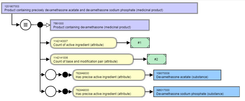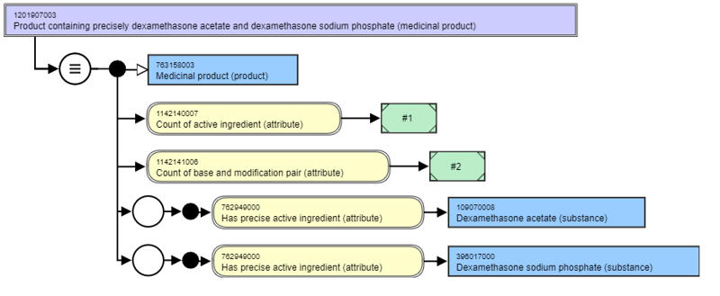 The count of base and modification pair ensures that this multi-ingredient product does not incorrectly subsume under either of the single ingredient products, since they have a base and modification pair count of one, and this has a base and modification pair count of two. It can subsume under the parent "Product containing only dexamethasone" as shown in the diagram above, as "Product containing only dexamethasone" has a count of base of active ingredient of 1, and that one is dexamethasone (substance), which is the same as for the "Product containing only dexamethasone acetate and dexamethasone sodium phosphate".