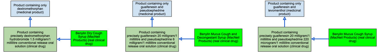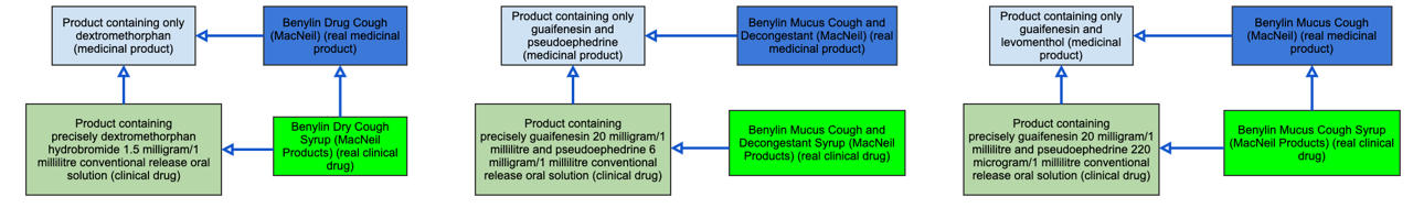 In the example below, the three real clinical drug products all share the same product name ("Benylin®") in one jurisdiction, but they do not relate to a single real medicinal product due to differences in their active ingredient substances.