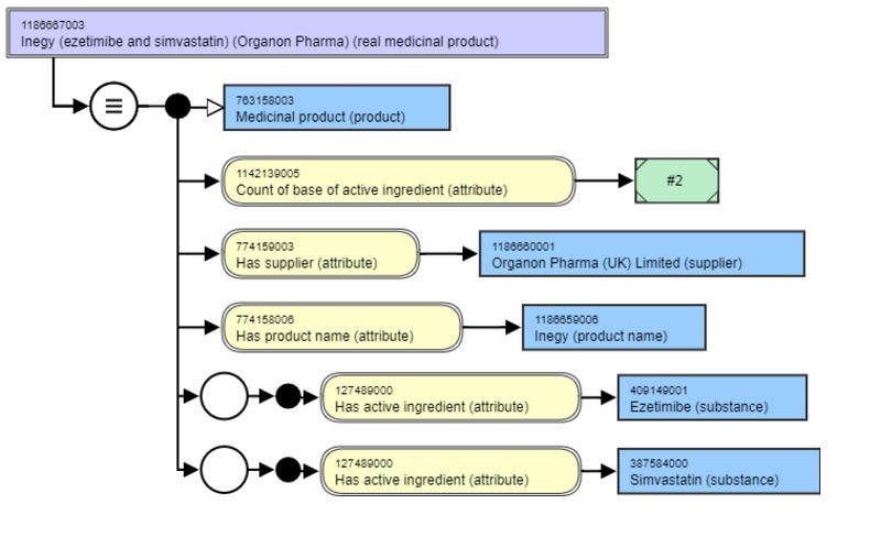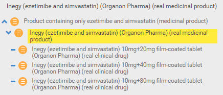 The RMP "Inegy (product)" shown in a taxonomic view in Figure 2 below presents products marketed by Organon Pharma UK Limited under a single name (Inegy) and containing only simvastatin AND ezetimibe as the active ingredient substances, and showing the RCD concepts associated with it: