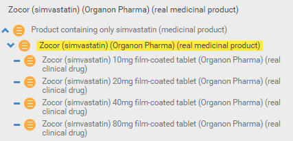 The RMP "Zocor (product)" shown in a taxonomic view in Figure 1 below presents products marketed by Organon Pharma UK Limited under a single name (Zocor) and containing only simvastatin as the active ingredient substance and shows the RCD concepts associated with it: