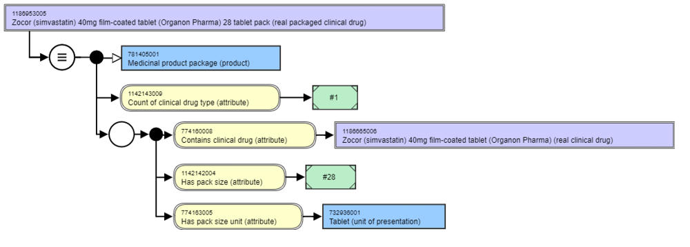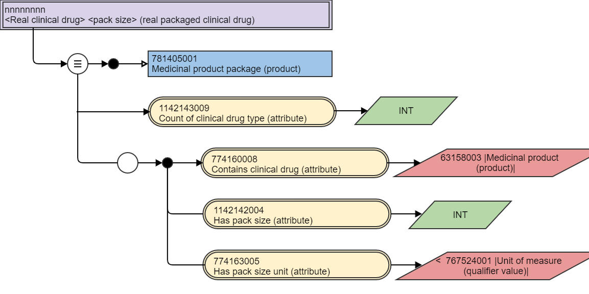 | Notes                | Represents the real clinical drug contained in the packaged product. It is currently not possible to explicitly specify an expression to describe the range of real clinical drugs from a national extension, since a range cannot currently recognise a set of concepts with a particular semantic tag — in this case, (real clinical drug). For the interim, the range is specified as descendants of the root medicinal product concept: `763158003 \|Medicinal product (product)\|`. |