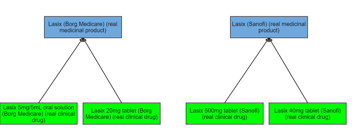 Due to the nature of the domain where either individual products or whole product sets, with their brand name and authorization, can be sold from one organization to another, it may be that even within one jurisdiction a single product name will be associated with more than one supplier. For those extensions that populate the real medicinal product concept class, in situations where individual real clinical drugs share the same product name but have different supplier organizations, two real medicinal products will exist, as shown in the example below: