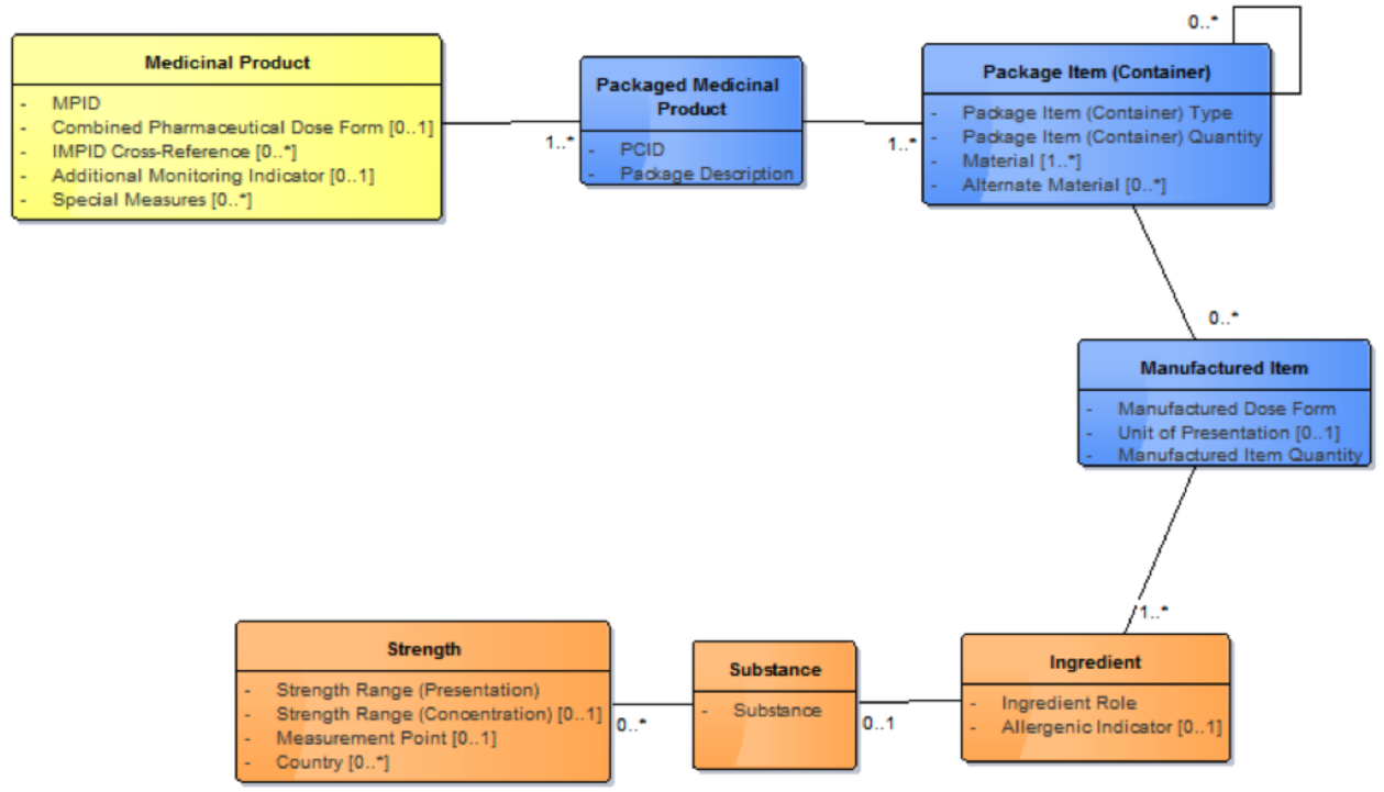 To correctly interpret "*one countable instance of a whole of medicinal product* ", it is important that this is seen in the context of the overall description of a medicinal product, which is always presented from the manufacturer as a "packaged medicinal product". Note that description of packaged medicinal products is outside the scope of the international release but may be included within a national extension. The IDMP Medicinal Product model describes this, showing how the Manufactured Item is related to the Packaged Medicinal Product via the Package Item (Container). This is a recursive class that represents both the package as supplied by the manufacturer (and, for example, labelled with the GTIN, the batch number and the expiry), and through a recursive relationship, with any sub-packages inside the outer pack.