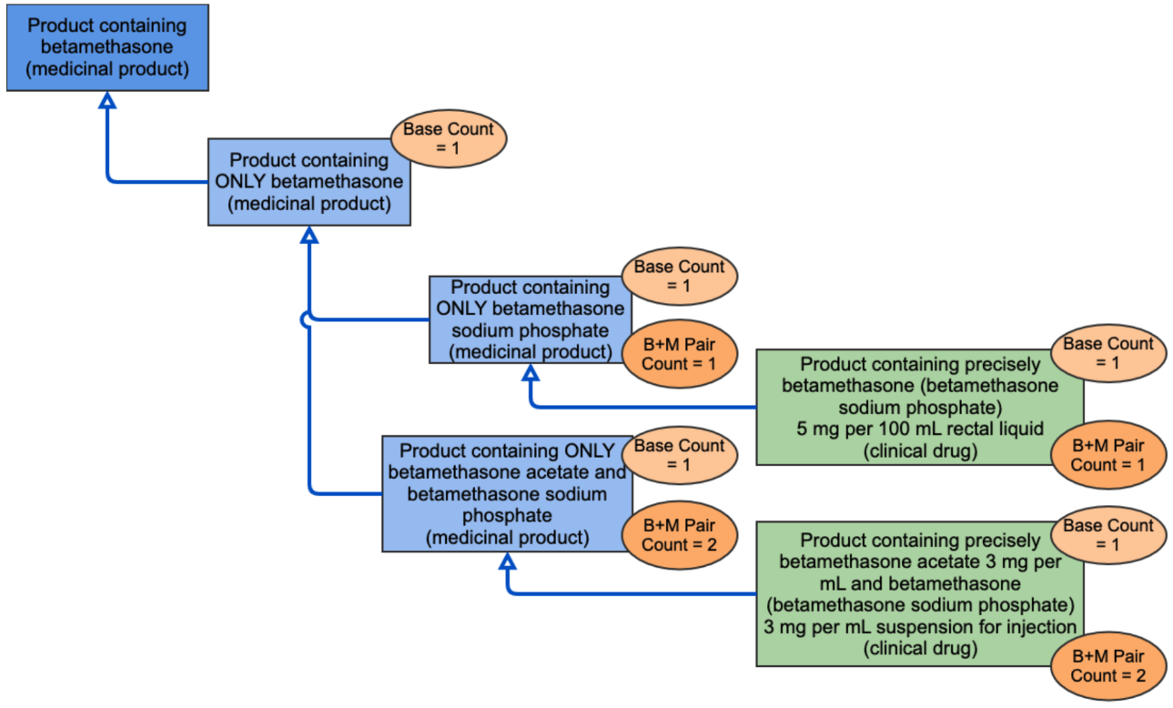 Base count alone would not prevent the incorrect subsumption of the "Clinical drug containing precisely betamethasone sodium phosophate and betamethasone acetate" to the parent medicinal product concepts containing only betamethasone sodium phosophate (or only betamethasone acetate - not shown on the above diagram). By adding in the Count of base + modification pair, that incorrect subsumption is avoided and the "Clinical drug containing precisely betamethasone sodium phosophate and betamethasone acetate" is correctly subsumed by just the one parent medicinal product - that "containing only betamethasone sodium phosophate and betamethasone acetate". The (grand)parent medicinal product concept "Product containing only betamethasone" does not (cannot) have a Count of base + modification pair, since it does not have any active ingredient modification described; therefore it can correctly parent medicinal product concepts containing only betamethasone sodium phosophate, containing only betamethasone acetate (not shown) and containing "only betamethasone sodium phosophate and betamethasone acetate", because they all share a base count of 1, relating to betamethasone.