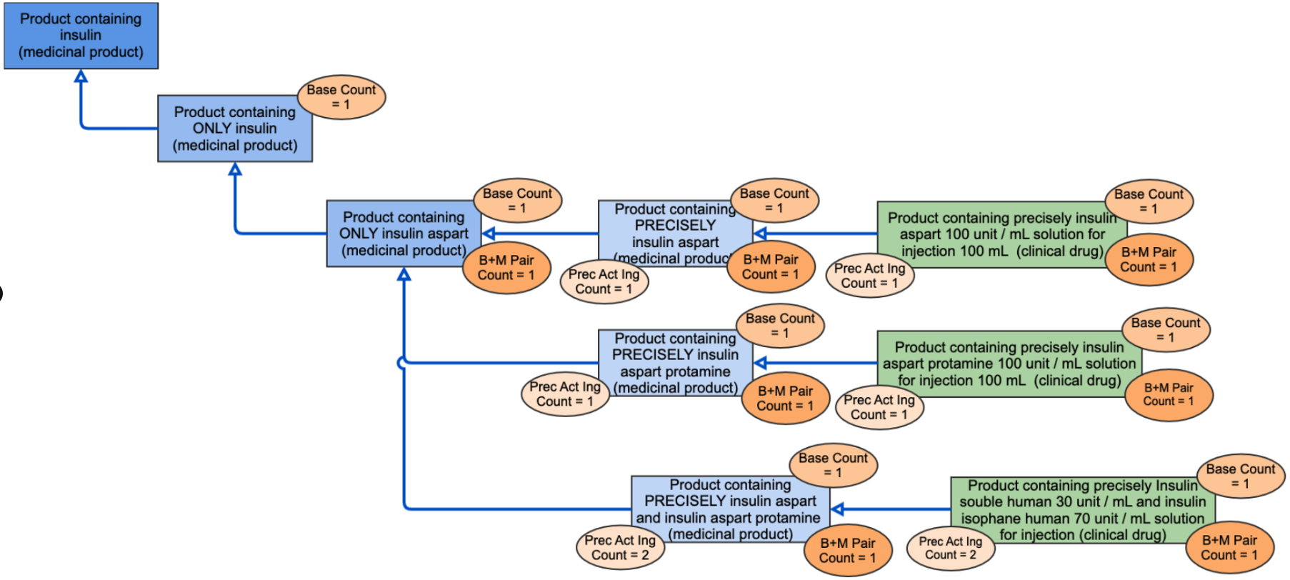 Neither base count alone nor base count and base + modification pair count would prevent the incorrect subsumption of the "Clinical drug containing precisely insulin aspart and insulin aspart protamine" because both give a count of 1. The differentiation comes from the counting the precise active ingredient substances. This then gives the (optional in the international release) intermediate parent concepts of "Medicinal product containing precisely" either "insulin aspart", "insulin aspart protamine" or "insulin aspart and insulin aspart protamine" with their correct clinical drug concepts as children. The MP (precisely) concepts are then correctly subsumed to the (grandparent) MP (only) concept of insulin aspart only, on the basis of the base count of 1.
