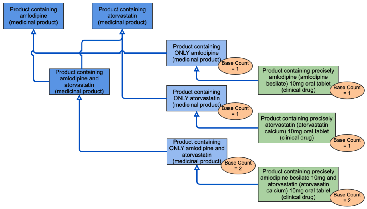 The base count facilitates the correct subsumption relationship between the "Product containing only amlodipine and atorvastatin" and the clinical drug that contains only amlodipine and atorvastatin. It avoids the "Product containing only amlodipine and atorvastatin" being incorrectly subsumed by the concept "Product containing only amlodipine" or by the concept "Product containing only atorvastatin" since a concept of a base count of 1 will not subsume a product with a base count of 2. Similarly the clinical drug concepts containing only amlodipine or only atorvastatin, both of which have a base count of 1, are prevented from being subsumed by the "Product containing only amlodipine and atorvastatin" which has a base count of 2.