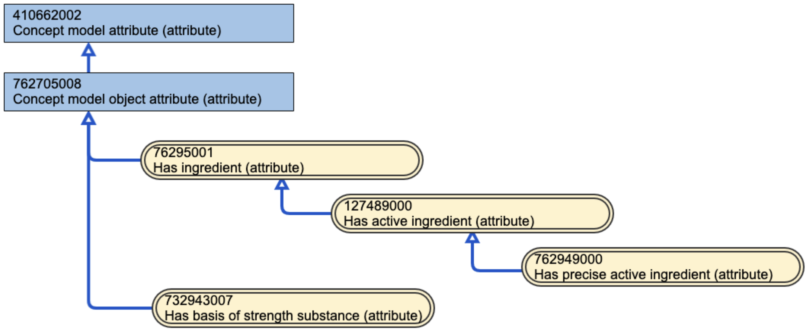 The following sections discuss the attribute concepts used to represent the ingredient substances of concepts in the medicinal product hierarchy.