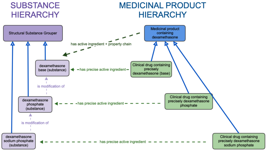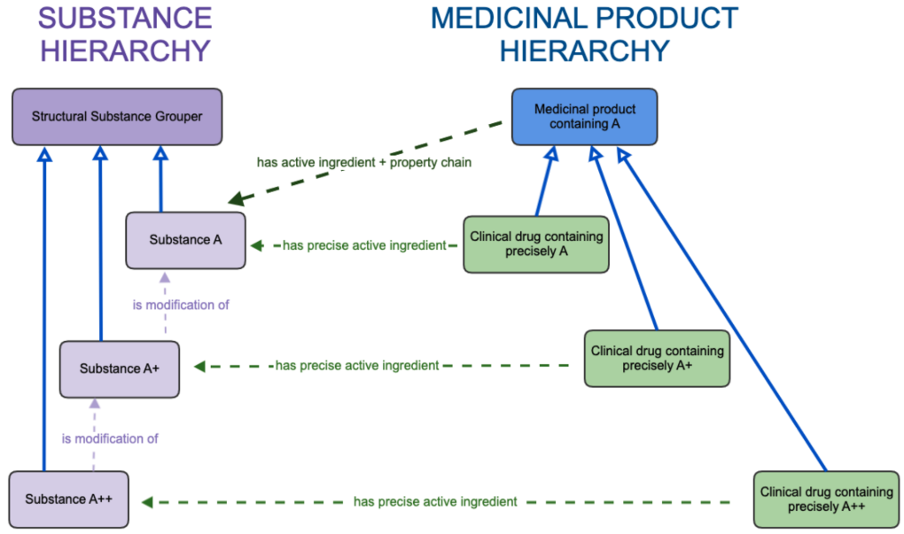 The Medicinal Product and Medicinal Product Form use the active ingredient attribute, which will have a role chain attached to it, so that it can use the Substance hierarchy as a hierarchy through the "is modification" relationship. This allows the classifier to make the appropriate relationships between MPs, MPFs and CDs based on their active ingredient substances. The role chain is a characteristic that is not inherited, so the precise active ingredient attribute does not inherit this characteristic. The Clinical Drug uses the precise active ingredient attribute/relationship which will use the Substance hierarchy as a flat list without role chaining, so that a clinical drug containing a modified substance is not subsumed under a clinical drug containing the unmodified substance, thereby unintentionally adding more recursion to the clinical drug class (for example: so that a morphine (base) precise clinical drug does not subsume a clinical drug containing precisely morphine sulphate).