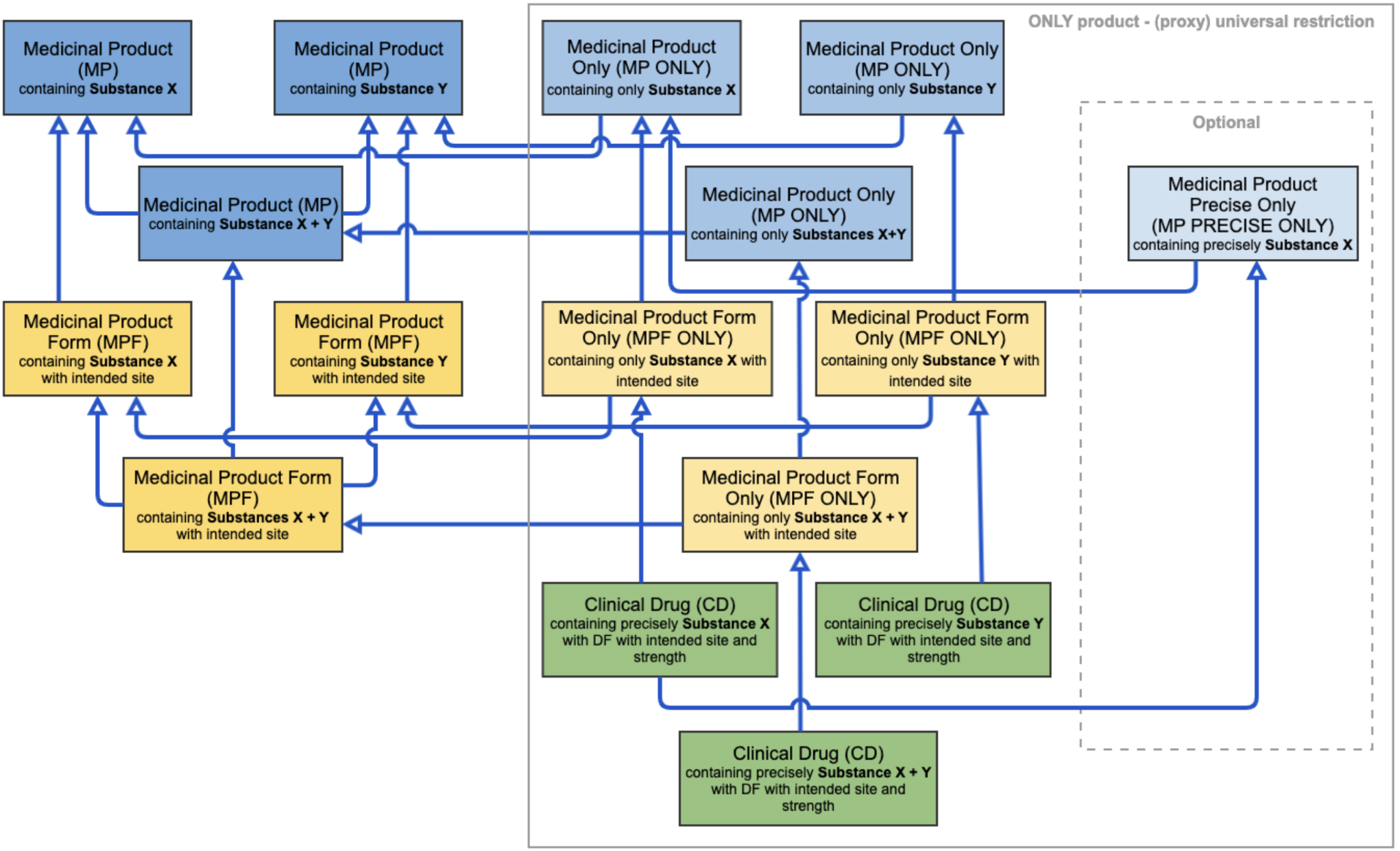 The last model diagram below shows multi-ingredient medicinal products, and therefore, has increased complexity. It again shows the three groups (MP, MPF and CD) with MP classes shown in shades of blue, MPF classes in shades of yellow and the CD class in green; each with two single active ingredient representations (X and Y) and one multi-ingredient representation (X + Y) and then the relationships between these. It shows how the single ingredient "containing" classes (the open world classes) subsume the appropriate multi-ingredient class, whereas the single ingredient "containing only" classes (the closed world classes) do not subsume the multi-ingredient class. The optional MP Precise Only class is present but is not shown with any multi-ingredient products, to limit complexity. MP Precise Only multi-ingredient products are discussed later in the [Ingredient Count Attributes](https://docs.snomed.org/education/snomed-ct-education-editorial-guide/readme/authoring/domain-specific-modeling/pharmaceutical-and-biologic-product/pharmaceutical-and-biologic-product-and-dose-form-attributes-summary/ingredient-count-attributes).