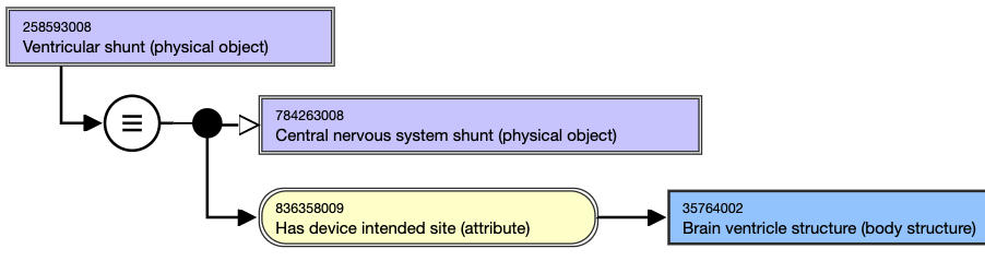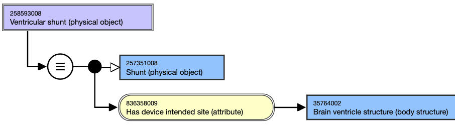 The following illustrates the **stated** view for 258593008 |Ventricular shunt (physical object)|: