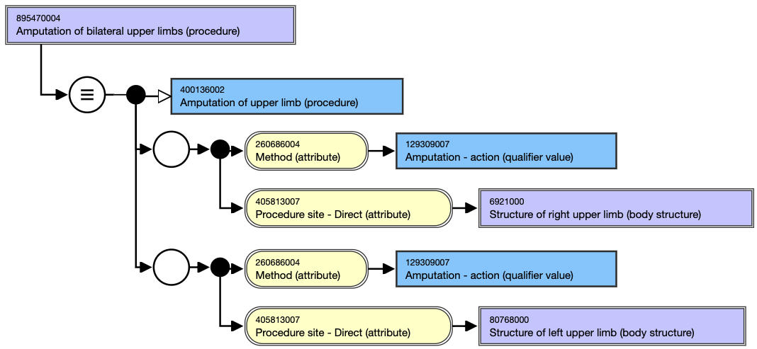 <figure><img src="https://3063935683-files.gitbook.io/~/files/v0/b/gitbook-x-prod.appspot.com/o/spaces%2FSZh4aZdgpviXMYp37bCy%2Fuploads%2Fgit-blob-7affbe9dcb1ce2f1aede39899450721a29475805%2Fimage%20(204).png?alt=media" alt=""><figcaption><p>Stated view of 895470004 |Amputation of bilateral upper limbs (procedure)|</p></figcaption></figure>