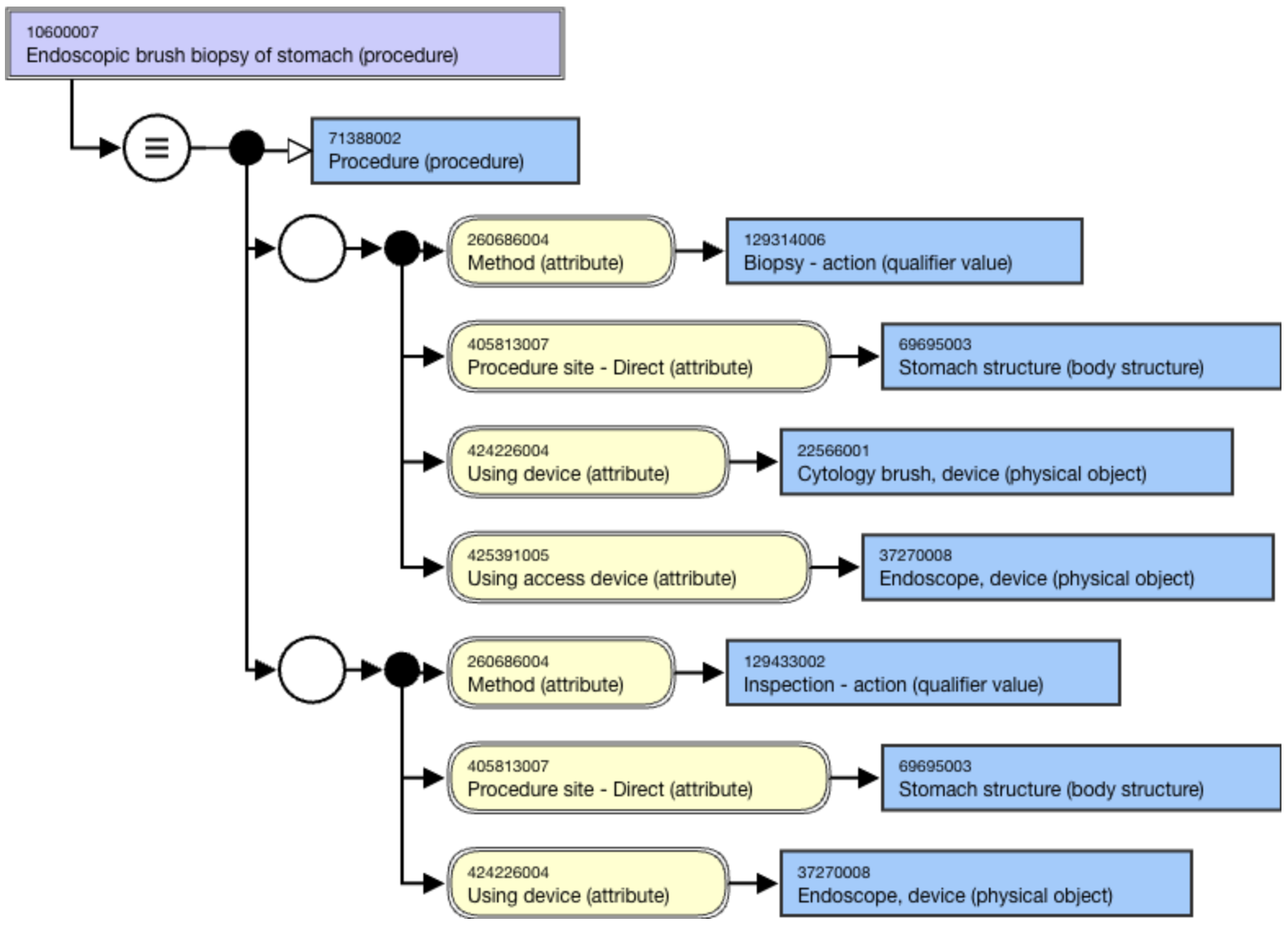 In all endoscopic procedures, a role group with Method of Inspection - action (qualifier value) + Using Device is mandatory. For endoscopies that require an incision, the role group to represent the incision is required. Where an additional action is performed during an endoscopy, a third role group is modeled with the applicable action.