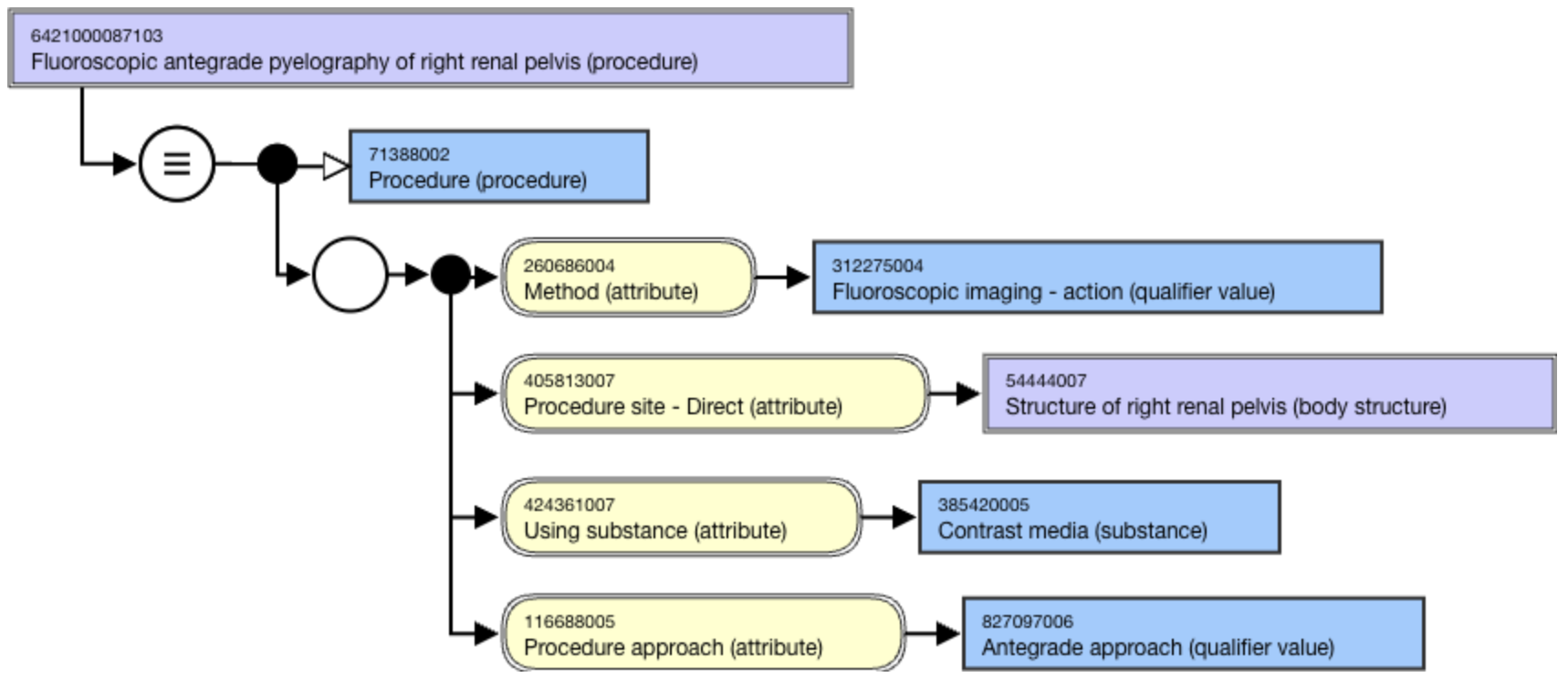 * 6421000087103 |Fluoroscopic antegrade pyelography of right renal pelvis (procedure)| using |Antegrade approach (qualifier value)|
