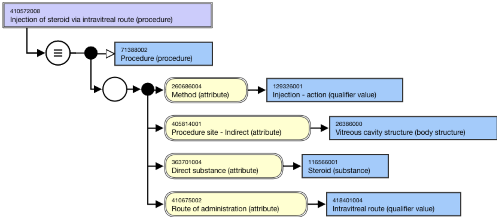 <figure><img src="https://3063935683-files.gitbook.io/~/files/v0/b/gitbook-x-prod.appspot.com/o/spaces%2FSZh4aZdgpviXMYp37bCy%2Fuploads%2Fgit-blob-81f3305dbf09e5fd5ce41001833a0b27933a50fa%2Fimage%20(235).png?alt=media" alt=""><figcaption><p>Stated view of 410572008 |Injection of steroid via intravitreal route (procedure)|</p></figcaption></figure>