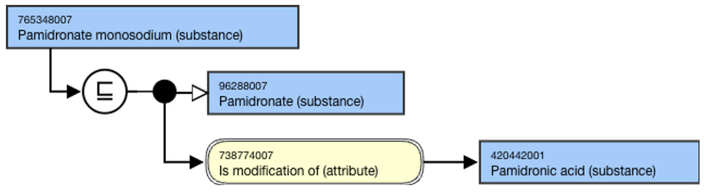 * Pamidronate monosodium (substance) IS MODIFICATION OF Pamidronic acid (substance). This is the **stated** and **inferred** view.