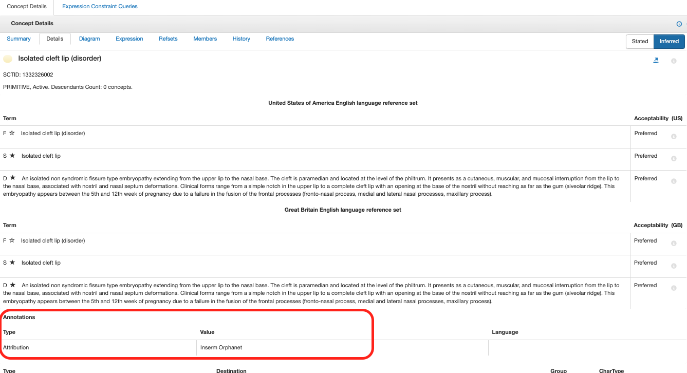 <figure><img src="https://3063935683-files.gitbook.io/~/files/v0/b/gitbook-x-prod.appspot.com/o/spaces%2FSZh4aZdgpviXMYp37bCy%2Fuploads%2Fgit-blob-e210c027d0a8eb1063d7f65cb8a6eb08f59257b4%2F256869352.png?alt=media" alt=""><figcaption><p>Figure shows attribution annotation is located in details tab of 1332326002 |Isolated cleft lip (disorder)| in the browser</p></figcaption></figure>