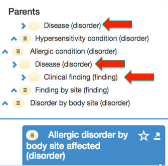421095001 | Allergic disorder by body site affected (disorder) |. However, 64572001 | Disease (disorder) | is subsumed by 404684003 | Clinical finding (finding)|, therefore 64572001 | Disease (disorder) | is the proximal primitive supertype concept.