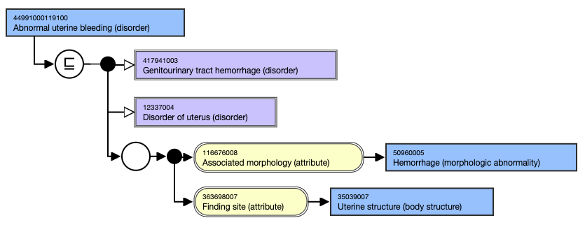 When the attributes are grouped, the relationships imply meaning towards each other. To continue the example above for 44991000119100 | Abnormal uterine bleeding (disorder) |, the following diagram shows the *Associated morphology* of Hemorrhage and the *Finding site* of Uterine structure in a relationship group together. The grouping can be interpreted that the finding site of the hemorrhage is the uterine structure.