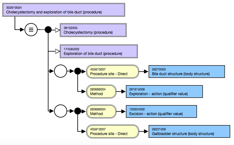 In the concept 302619004 | Cholecystectomy and exploration of bile duct (procedure) | within the following diagram, the relationship groups clarify that there is exploration of the bile duct and excision of the gallbladder. Without the relationship groups, the appropriate relationships between the attributes would be unclear; i.e. the exploration of the bile duct versus gallbladder and the excision of the bile duct versus the gallbladder.