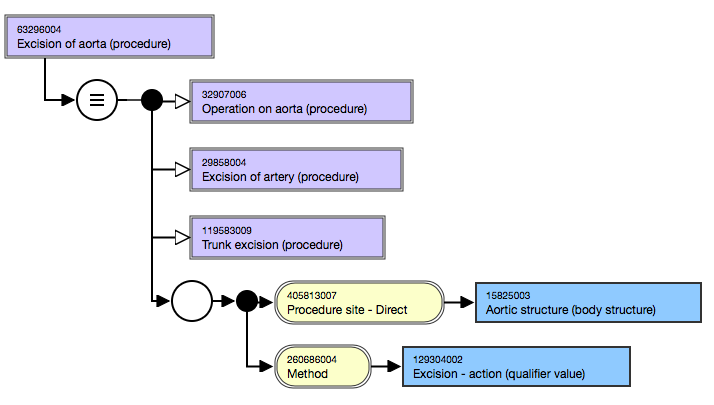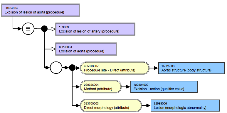 In the following diagram the attributes of the concept 50434004 | Excision of lesion of aorta (procedure) | are grouped. An author that explicitly states that the excision is of a lesion found in the aortic structure, by grouping the attribute-value pairs, provides the necessary information for the classifier. This enables 50434004 | Excision of lesion of aorta (procedure) | to be inferred as a subtype of 63296004 | Excision of aorta (procedure) |.