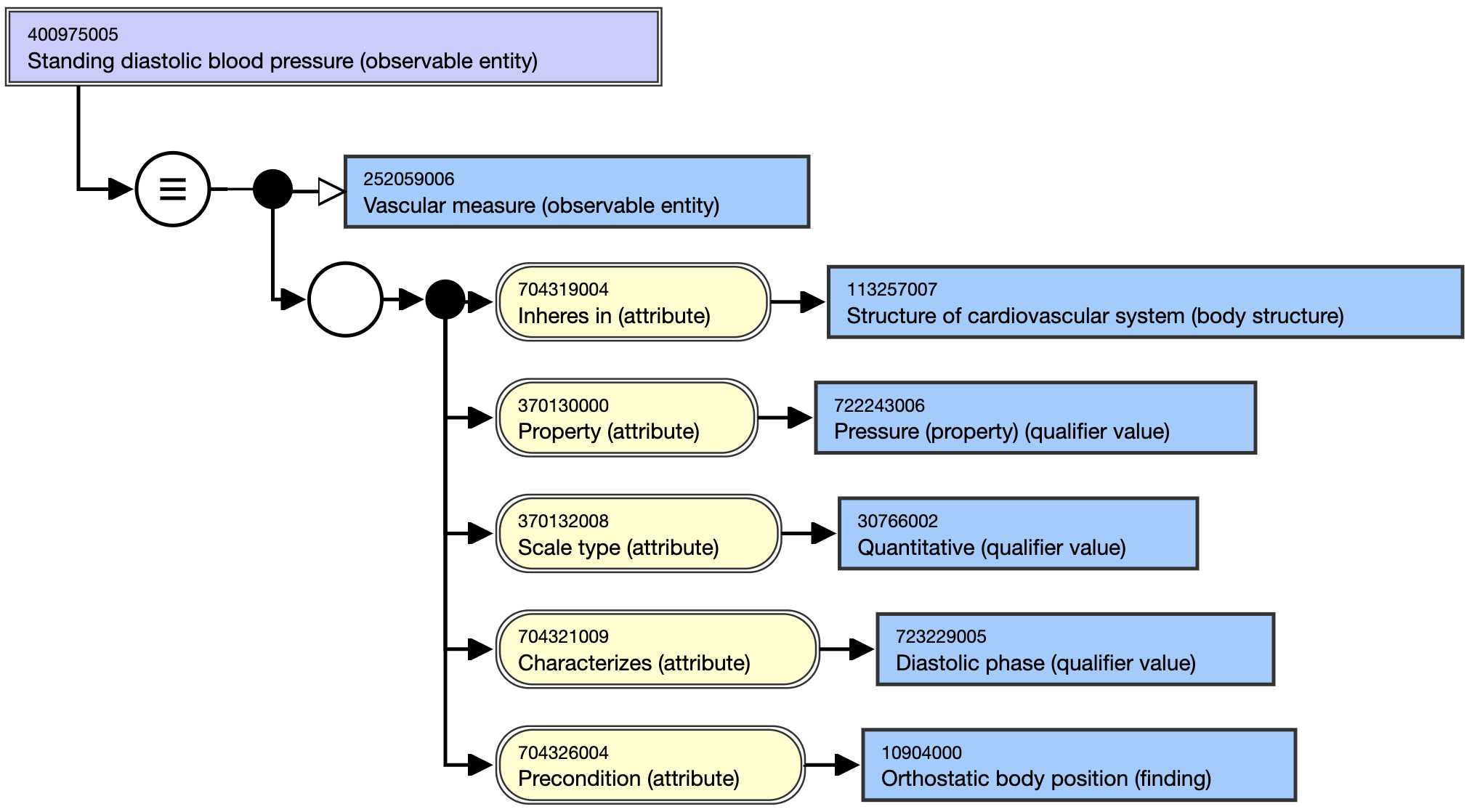 For example, 400975005 | Standing diastolic blood pressure (observable entity) | is represented using multiple attributes within one relationship group.