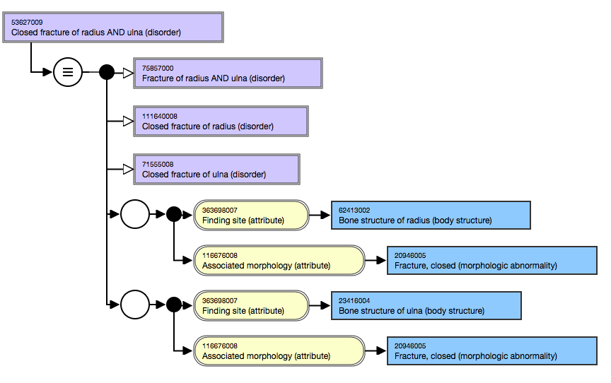 Two Finding site attributes are required to support the location of 53627009 | Closed fracture of radius AND ulna (disorder) |. Each 363698007 | Finding site (attribute) | and its respective target value are placed in a relationship group with the attribute 116676008 | Associated morphology (attribute) | with its target value of 20946005 | Fracture, closed (morphologic abnormality) |.