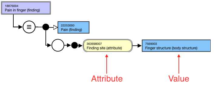 <figure><img src="https://3063935683-files.gitbook.io/~/files/v0/b/gitbook-x-prod.appspot.com/o/spaces%2FSZh4aZdgpviXMYp37bCy%2Fuploads%2Fgit-blob-d7b39d8244e86678940b22be9007804d2b095a98%2F174691689.png?alt=media" alt=""><figcaption><p>Stated view of 18876004 |Pain in finger (finding)| with the Finding site (attribute) and its value of Finger structure (body structure)</p></figcaption></figure>