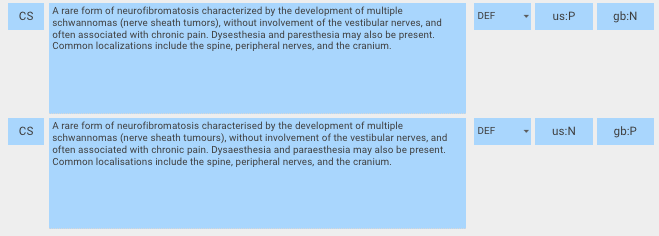 <figure><img src="https://3063935683-files.gitbook.io/~/files/v0/b/gitbook-x-prod.appspot.com/o/spaces%2FSZh4aZdgpviXMYp37bCy%2Fuploads%2Fgit-blob-78c7c64b422ccf21525e001530d558aee9484014%2Fimage%20(16).png?alt=media" alt=""><figcaption><p>Definition of 1332358007 |Full schwannomatosis (disorder)| with US and GB English acceptability values.</p></figcaption></figure>