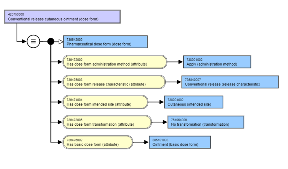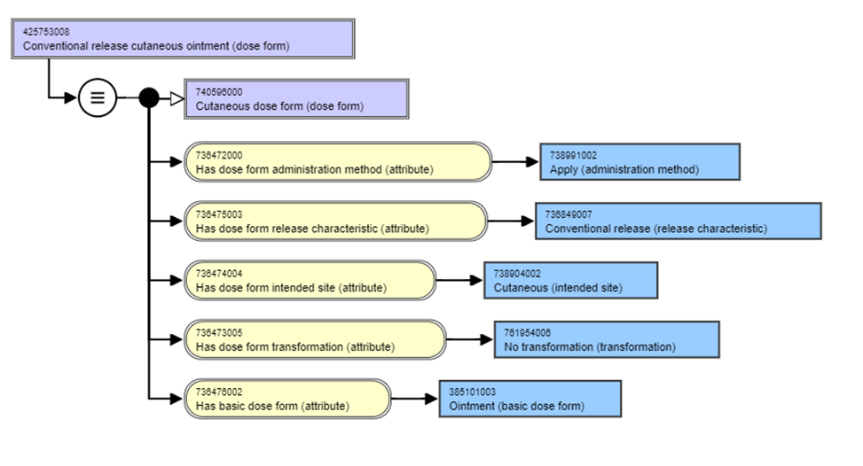 <figure><img src="https://2227259387-files.gitbook.io/~/files/v0/b/gitbook-x-prod.appspot.com/o/spaces%2FUBtt8xnBO4xFyq2mN9lM%2Fuploads%2Fgit-blob-050eab8458d4dbe95a519097d5483b05a5b3d7e4%2F154241708.png?alt=media" alt=""><figcaption><p>The diagram above shows the stated view of a cutaneous dose form concept and how the primitive concept is selected as a parent. Below, we can see in the same concept how the inferred view is showing the "Cutaneous dose form" grouper concept added in as the inferred parent concept after classification.</p></figcaption></figure>