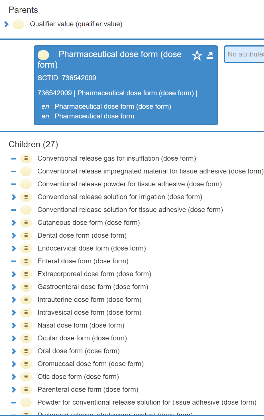 The parent (grouping) concept 736542009 | Pharmaceutical dose form (dose form) | has no attributes (and is therefore marked as “primitive”), but the child concepts - the PDF concepts themselves, have a concept model:
