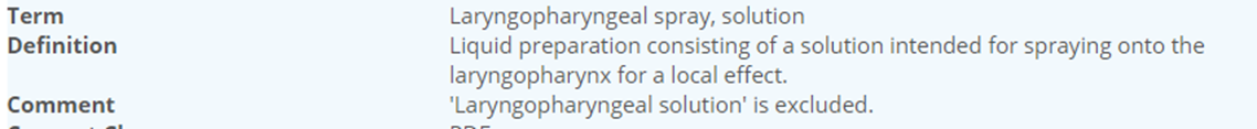 <figure><img src="https://2227259387-files.gitbook.io/~/files/v0/b/gitbook-x-prod.appspot.com/o/spaces%2FUBtt8xnBO4xFyq2mN9lM%2Fuploads%2Fgit-blob-2f0e2b0fd4f5a704d55f658c3c91462b492d5579%2F154241703.png?alt=media" alt=""><figcaption><p>This exclusion statement in the Comment section guides a marketing authorisation applicant with a product that is intended to apply directly as laryngopharyngeal solution to not use this PDF since this PDF is explicitly for use as a spray.</p></figcaption></figure>