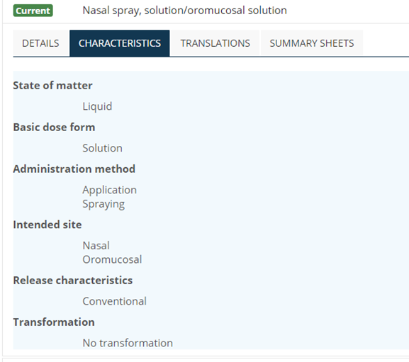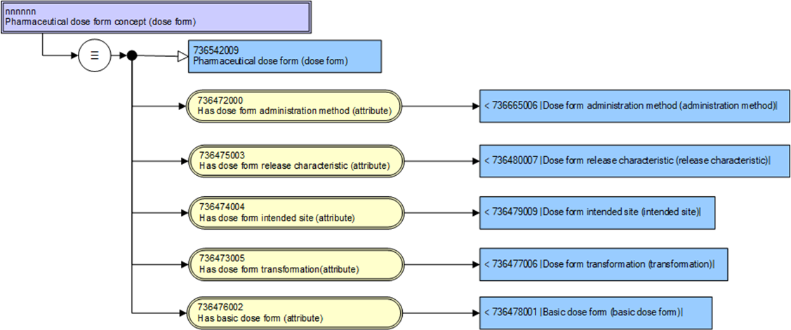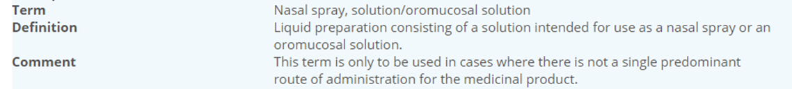<figure><img src="https://2227259387-files.gitbook.io/~/files/v0/b/gitbook-x-prod.appspot.com/o/spaces%2FUBtt8xnBO4xFyq2mN9lM%2Fuploads%2Fgit-blob-51863d3d5f0fc14b3175bbf807141e878277bb6d%2F154241702.png?alt=media" alt=""><figcaption><p>A number of EDQM PDF concepts have multiple values for a characteristic; most of these have the comment emphasising that the multiple values have equal emphasis in use; in the above example for the dose form will function equally as a nasal spray or in oromucosal application. This corresponds well to a SNOMED CT PDF concept where the logical definition will not support any "weighting" between attributes.</p></figcaption></figure>