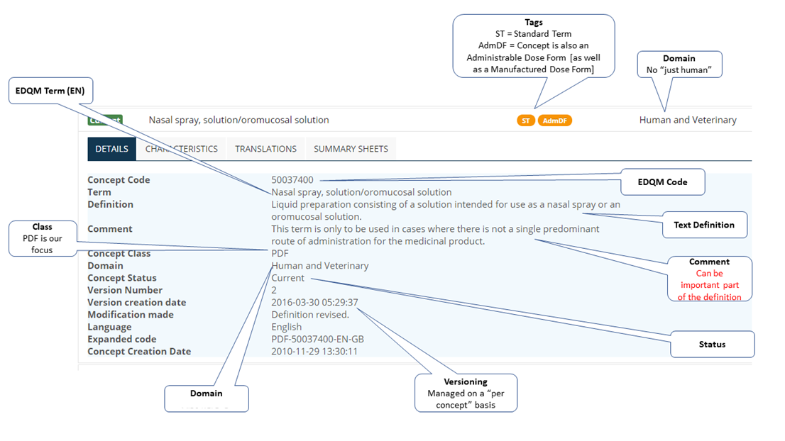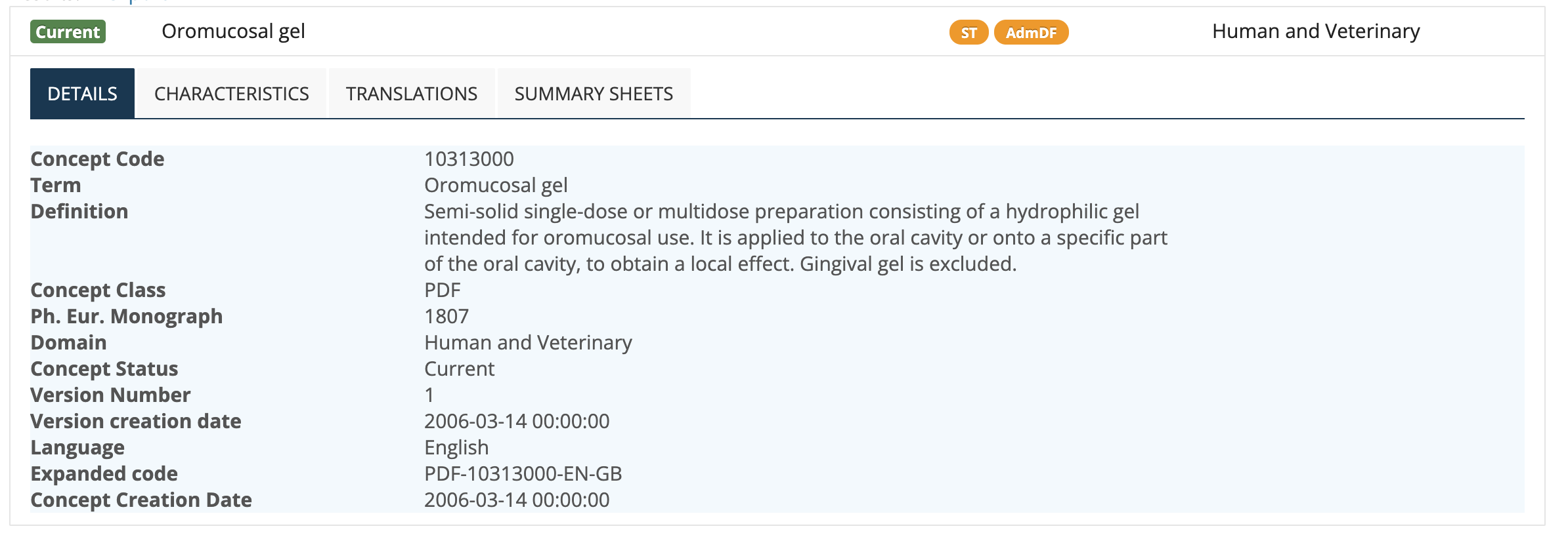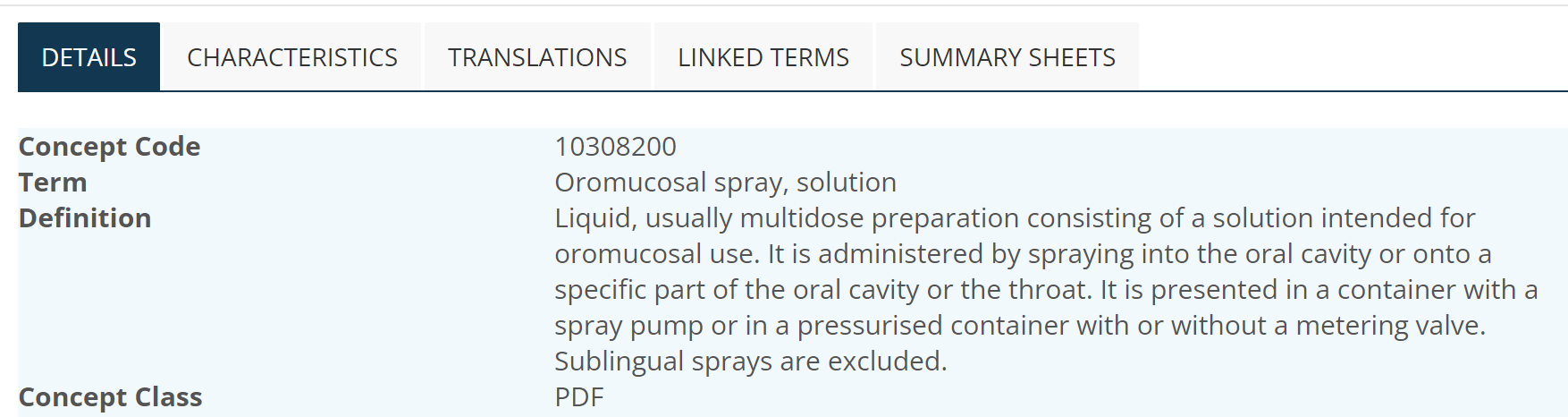 The EDQM PDF concept has a name (term) and a (text) definition; these are the most important pieces of data to understand the concept's meaning; this is given in English. In the "Translations" tab, the name of the dose form is given in the other European languages.