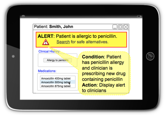 The clinical setting in which this hypothetical tool has been applied is the prescribing of a medication. In this example, the patient has previously had an 91936005 <mark style="color:blue;">|</mark> Allergy to penicillin<mark style="color:blue;">|</mark> recorded. When prescribing a new drug, such as 27658006 <mark style="color:blue;">|</mark> Amoxicillin<mark style="color:blue;">|</mark>, an alert is displayed to remind the clinician of the previously diagnosed allergy. The application may also provide a mechanism to search for alternative medications. Note that the mechanics of this workflow uses a predefined rule which specifies a condition to be evaluated and an action to be taken if the condition evaluates to true.