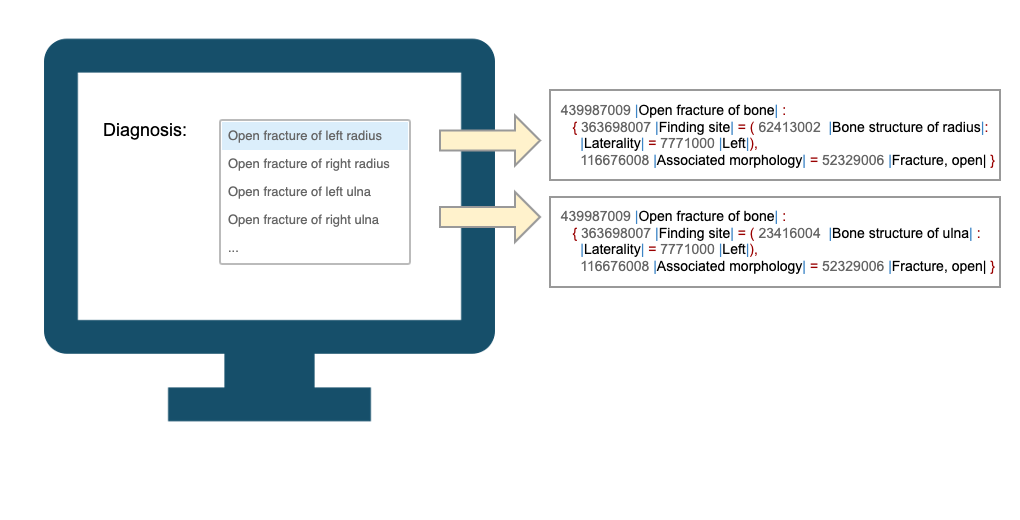 In the example shown in the image below, the user interface includes a list of phrases such as “Open fracture of left radius”, and “Open fracture of right radius”. Some of these phrases may be associated with precoordinated content (either via mapping or the released SNOMED CT descriptions), while other phrases may be associated with postcoordinated expressions. In this example, the phrase “Open fracture of left radius” and “Open fracture of left ulna” is associated with postcoordinated expressions.