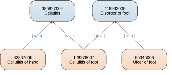Jedes Konzept kann |is-a|-Relationen zu mehreren anderen Konzepten haben (d. h. ein Konzept kann mehrere Eltern-Konzepte haben). Daher ist die SNOMED CT Hierarchie kein einfacher Baum, sondern hat eine Struktur, die als Polyhierarchie bezeichnet wird.